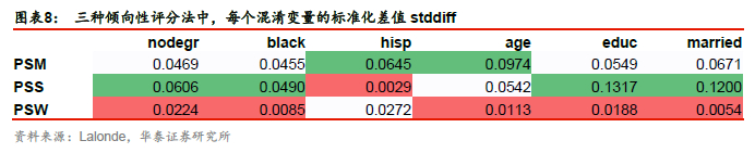 图表26展示了各倾向性评分方法中,每个混淆变量的标准化差值stddiff。总体来看,倾向性评分加权法(PSW)中各混淆变量的标准化差值最小,说明PSW中混淆变量在处理组和对照组间较均衡,其因果效应估计值可能更可靠。