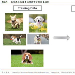 首先以一个图像识别问题为例:识别一张图片中是否有狗。如图表1所示,如果训练集有选择性偏差,使得我们拿到的图片有80%都是草地上的狗,这样就会导致在训练集中草地这一特征会和图片中是否有狗这个标签十分相关。基于这样的有偏数据集学习到的预测模型,很有可能会将草地学习成很重要的特征,但显然这是不合理的,图片中的草地并不能决定是否有狗,真正决定图片中是否有狗的特征是狗的鼻子、耳朵、尾巴等等。对于测试集,如果跟训练集一样也是狗在草地上,则模型可以正确地预测;如果图片中的狗在有绿植的沙滩上,模型或许能识别出来;但是如果图片中的狗在水里,模型则大概率会识别不准。因此这样的模型对于未知测试集的预测效果并不稳定。