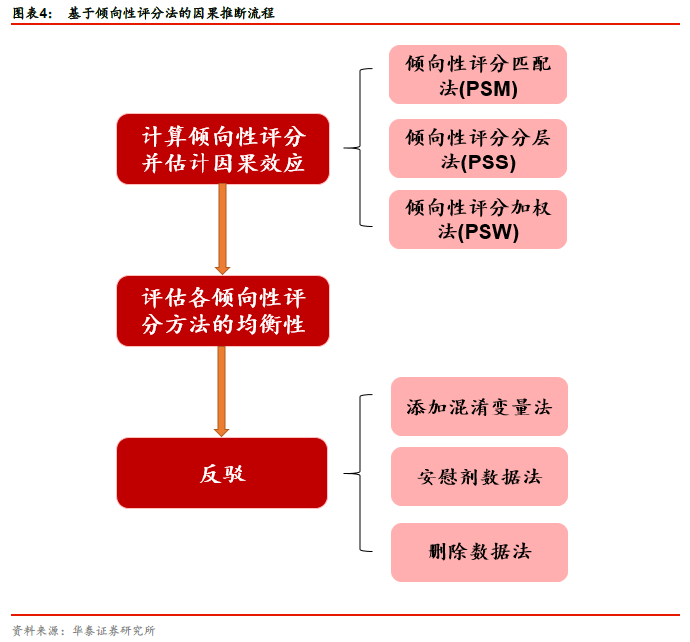 倾向性评分法由Rosenbaum和Rubin于1983年首次提出,是控制混淆变量的常用方法,其基本原理是将多个混淆变量的影响用一个综合的倾向性评分来表示,从而降低了混淆变量的维度。图表4展示了基于倾向性评分法的因果推断流程,主要包含三个关键步骤。本文将逐一进行详细说明。