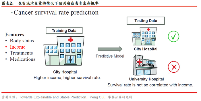 再举一个医疗领域的例子:预测一个癌症患者的生存率。假设我们拿到了某个城市某个医院的数据,基于该数据学习到的模型有可能会把患者的收入学习成很重要的特征。当然这也是有道理的,收入高的患者能负担得起更好的治疗,生存率也会越高。但是收入并不是患者生存率的决定因素,真正影响生存率的是患者接受的治疗水平以及患者本身的身体素质等因素,即使是收入很高的患者,如果没有接受很好的治疗,或者本身体质虚弱,免疫力低下,生存率依然会很低。利用该模型做预测时,如果未来要预测的患者同样来自该医院,我们可能会得到很准确的预测结果。但是如果要预测的患者来自大学校医院,由于校医院对患者给予的治疗不由收入决定,此时的预测结果很可能不准确。