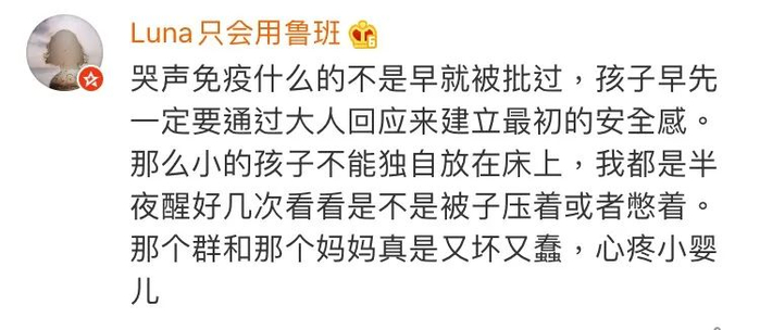 宝宝在几个月的时候,会有一个“翻身倒退期”,这阶段宝宝晚上睡觉会不停的翻身,直到宝宝会趴睡了,才算完成“解锁趴睡”这个任务,结束倒退期。而群里有“老师”会提供训练婴儿独立睡觉的“指导”,让婴儿跟母亲分房睡,并且睡在完全漆黑的空间里。