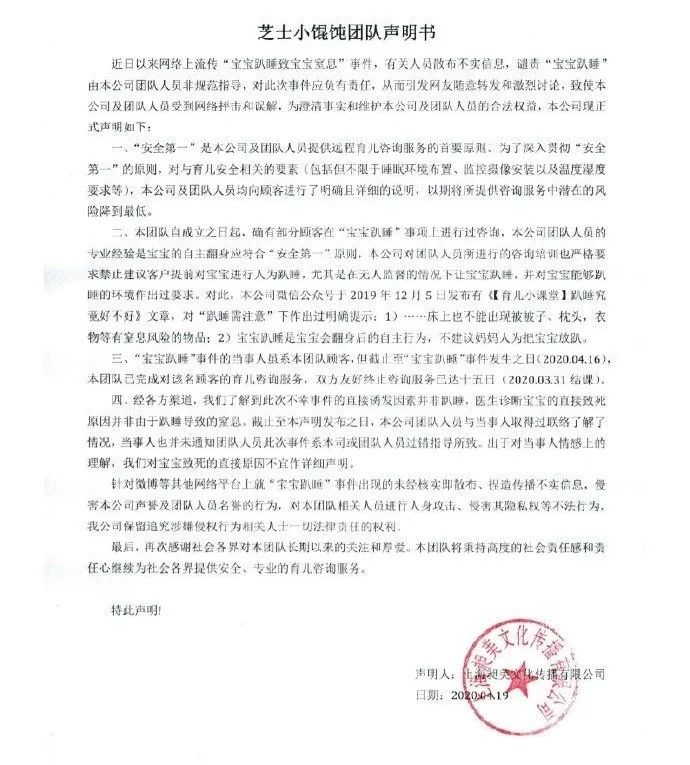 声明中称:孩子直接死因并非趴睡,早先购买的育儿咨询服务已于3月31日停止,且与当事母亲沟通过,孩子具体死因不便透露。