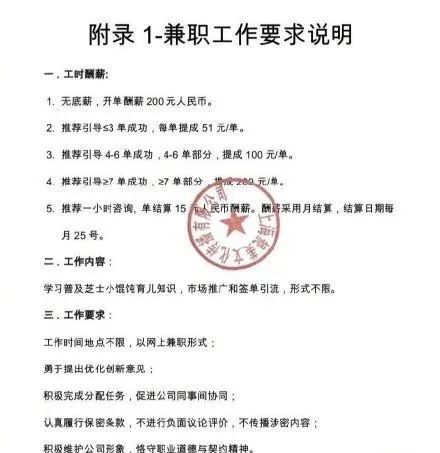 多名购买过课程的孩子家长告诉记者,团队的育儿师很多都是第一批从“馄饨妈妈”那里学习出来的妈妈。某位家长提供的一份“芝士小馄饨”兼职工作说明显示,拉人报班首单有200元的薪酬,开多单可以分提成。