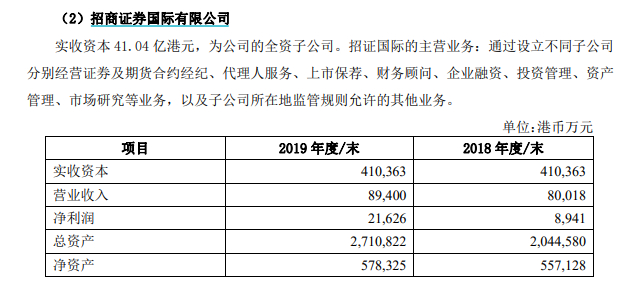 截至2019年底,招证国际实收资本为41.04亿港元,2019年实现营收8.94亿港元,实现净利润2.16亿港元。