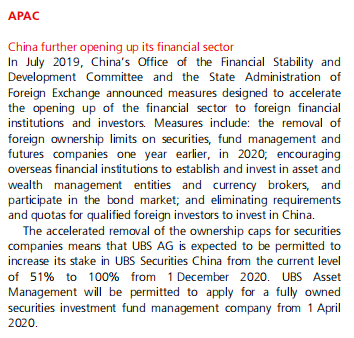 瑞银集团认为,这意味着瑞银集团将从2020年12月1日起,获准从51%增持瑞银证券中国(UBS securities China)的股份至100%。从2020年4月1日起,瑞银资产管理(UBS Asset Management)将获准申请成立一家全资拥有的证券投资基金管理公司。