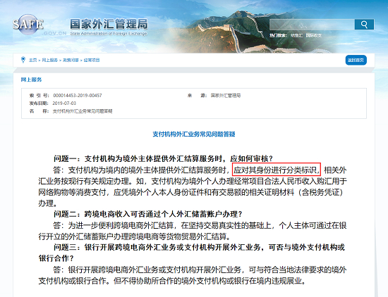 2019年7月,外汇局发布《支付机构外汇业务常见问题答疑》,其中明确指明,支付机构在为境内的境外主体提供外汇结算服务时,应对其身份进行分类标识。