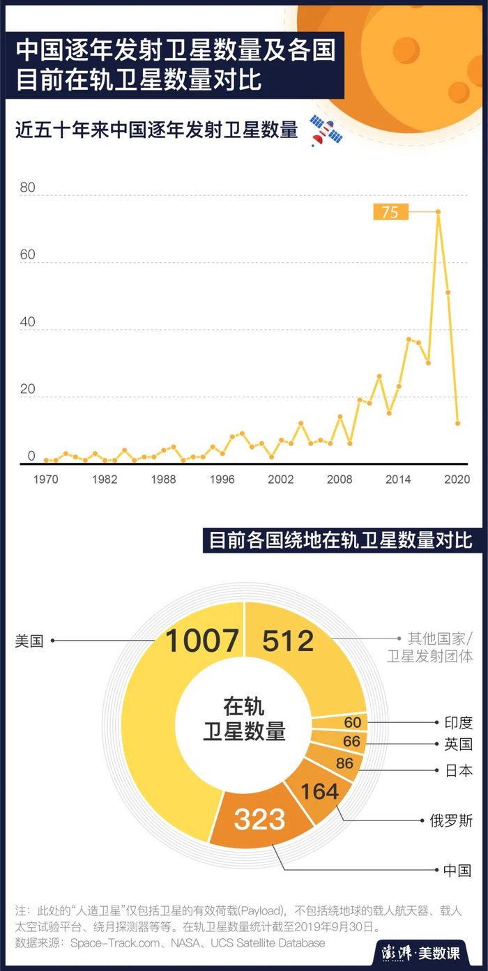 而据UCS Satellite Database统计,截至2019年9月30日,中国一共有323颗卫星仍然正常地在太空上运作;这个数量目前仅少于美国,排名世界第二,多于俄罗斯、日本、英国、印度等国。