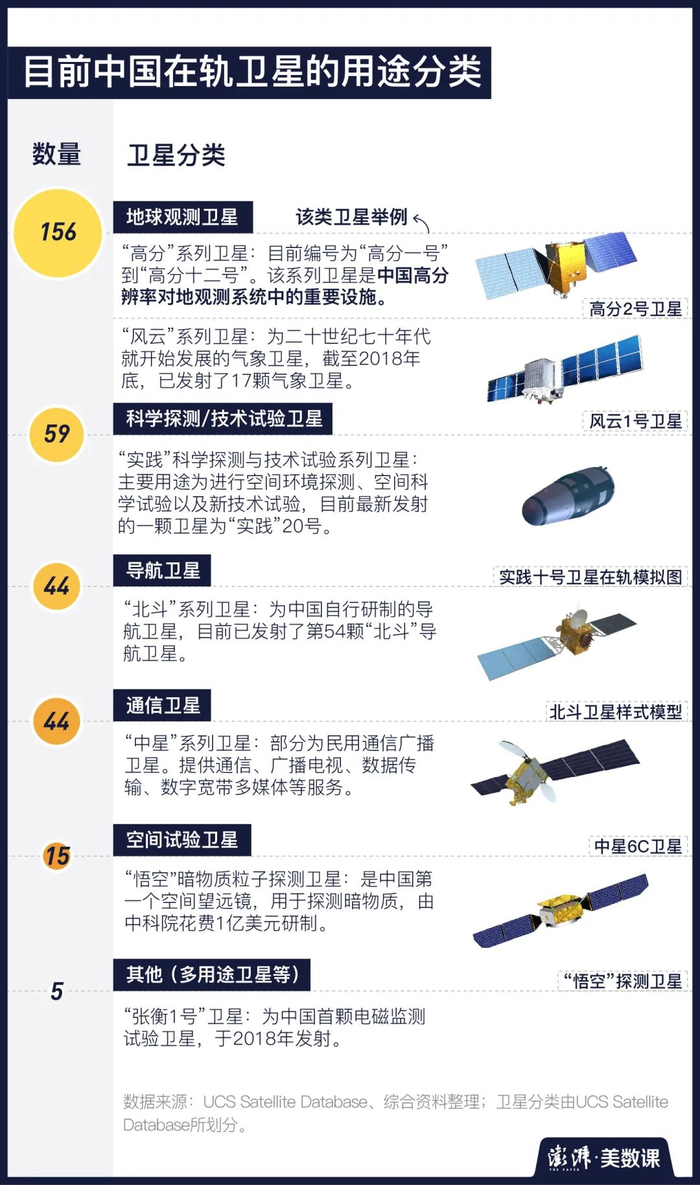 按照UCS Satellites Database对卫星用途的分类,现今,我国仍然在运作的323颗卫星,可被分为地球观测卫星、科学探测/技术试验卫星、导航卫星、通信卫星、空间试验卫星等几个种类。