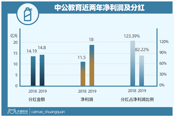 2018财年,中公当年的净利润是11.5亿,公司大笔一挥,决定分红14.19亿,比净利还多。
