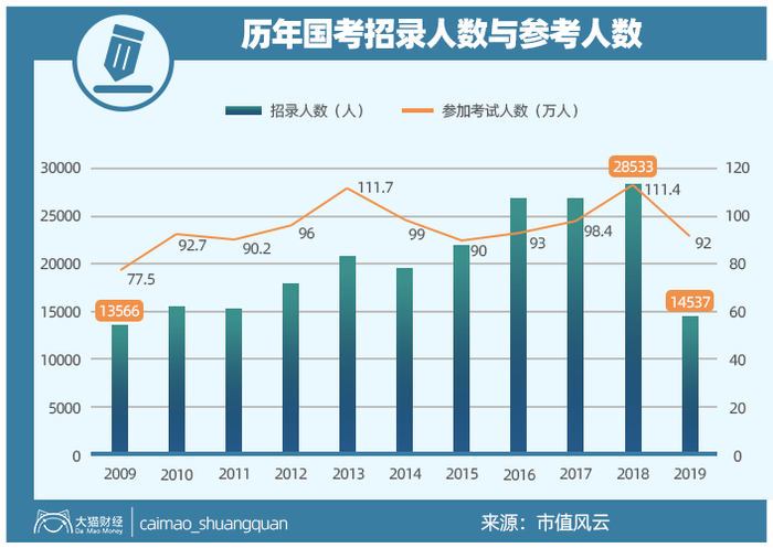 像最受关注的国考,2019年招录人数是14537,今年的计划是24128,多了接近一万人。