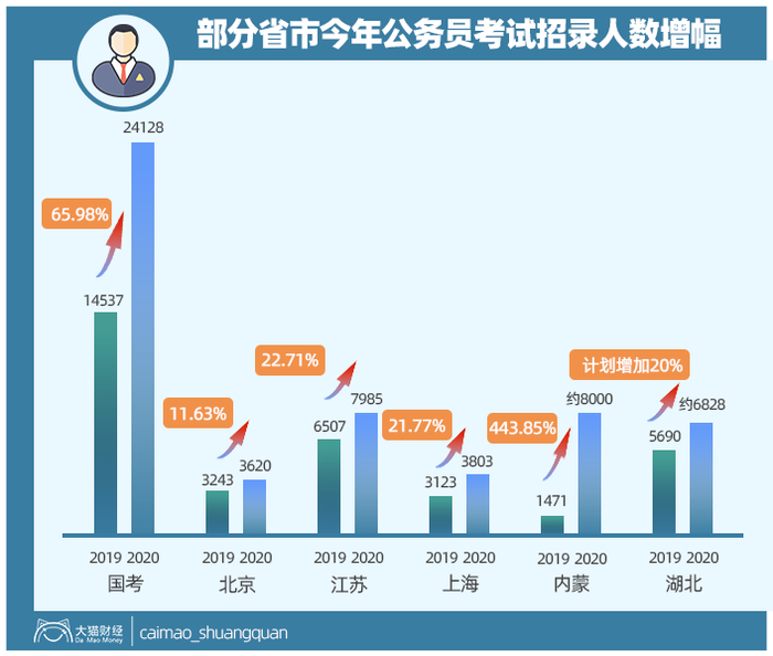 各省市的公务员也在大幅扩招,在已经公布的几个地方,最厉害的是内蒙古,去年招生1471人,今年计划8000人左右,直接扩了4.4倍。