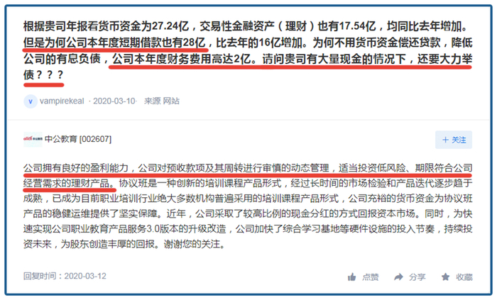 2019年报中,中公的期末货币资金有27.24亿,短期借款也有28.67亿,这种操作在上市公司中,属于存贷双高,是很多爆雷股的共同特点,不得不引起投资者们的担忧,于是有人就问了:
