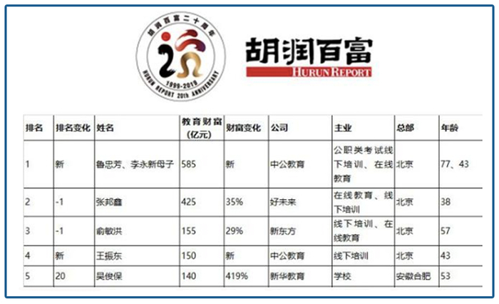 年初公布的胡润百富榜单中,教育领域排在第一的就是中公教育的大股东鲁忠芳、李永新母子。他们的身价比新东方的俞敏洪,学而思背后的好未来创始人张邦鑫这俩人加起来还多5亿,而中公教育的另一位联合创始人王振东排在第4,身价只比俞老师少5亿。