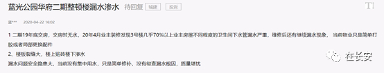 蓝光公园华府二期于2019年12月开始交房,据多位业主反应,当时并未通水通电,全是临水临电。受疫情影响,今年4月开始陆续装修,但多户反映排水主管道存在严重漏水质量问题,甚至有业主反映3号楼几乎70%以上房屋存在不同程度漏水问题。