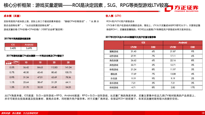 (2)字节跳动vs腾讯游戏品类:腾讯游戏积累深厚,游戏品类齐全,最初以休闲游戏为突破口,随后进行细分品类教育,逐步切入RAC/SPG、ACT、SLG、RPG、FPS、MOBA等,最终以高用户基数的爆款收割用户,形成大规模收入。字节跳动作为新进入者,也率先切入休闲游戏,并仅用时一年即成为新晋休闲游戏之王,在中重度游戏布局上,充分利用流量优势,切入SLG、MMORPG等LTV较高的游戏类型,以实现更高买量ROI。