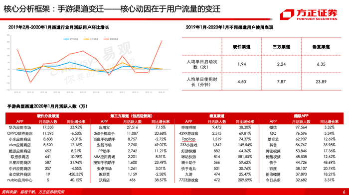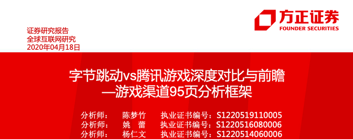 本文来自方正证券研究所于2020年4月18日发布的报告《字节跳动vs腾讯游戏深度对比与前瞻—游戏渠道95页分析框架》,欲了解具体内容,请阅读报告原文。杨仁文 S1220514060006