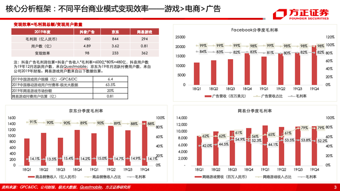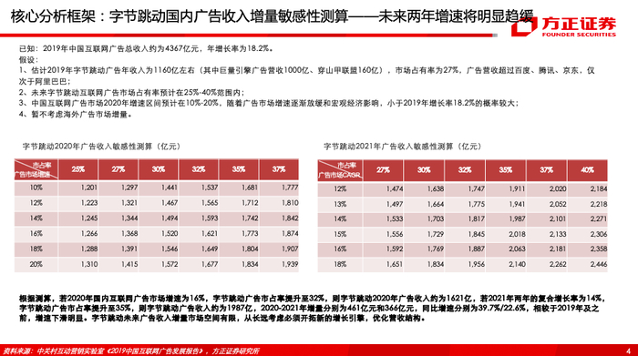 (2)移动互联网变现的本质是流量变现,其中变现效率:游戏>电商>广告,我们估算字节跳动2020-2021年广告同比增速将分别放缓至40%/23%,字节急需在广告之外寻找新的现金牛。移动互联网变现方式主要包括广告、电商、游戏等,我们用毛利润总额/变现用户数量来衡量不同变现方式的变现效率,2019年抖音广告、京东、网易游戏的变现效率分别为98/233/362元。我们同时对未来两年中国互联网广告增速及字节跳动市占率进行假设,若2020年国内互联网广告市场增速为16%(19年为18%),字节跳动广告市占率提升至32%(估测19年为27%),则字节跳动2020年广告收入约为1621亿,若2021年两年的复合增长率为14%,字节跳动广告市占率提升至35%,则字节跳动广告收入约为1987亿,2020-2021年增量分别为461亿元和366亿元,同比增速分别为39.7%/22.6%,相较于2019年及之前,增速放缓明显。