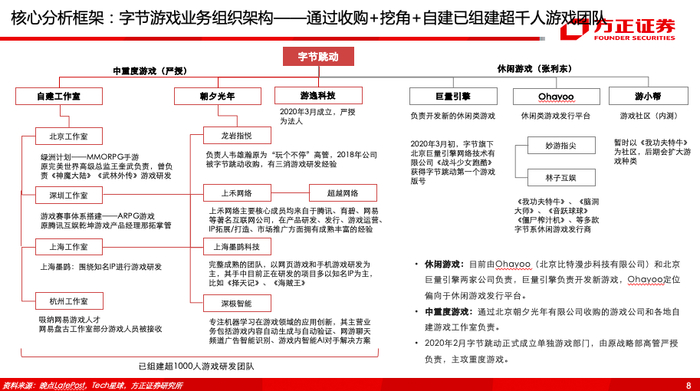 (2)字节跳动游戏业务组织架构:2020年2月正式成立游戏部门,中重度游戏由严授负责,自建四地工作室,包括北京工作室(原完美世界高级总监王奎武负责/曾负责《神魔大陆》《武林外传》等项目)、杭州工作室(部分原网易盘古工作室人员)、上海工作室(收购原三七互娱子公司上海墨鹍)、深圳工作室(收购上禾网络,其负责人为原腾讯互娱乾坤游戏产品经理那拓),以朝夕光年为据点,同时收购深极智能等。休闲游戏由张利东负责,包括负责开发新游戏的巨量引擎、定位休闲游戏发行平台的Ohayoo、定位游戏社区的游小帮(内测)。