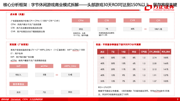 (3)字节跳动已成为新晋休闲游戏发行之王,主要采用“免费+广告”商业模式,头部游戏30天ROI可达到150%以上,留存率较为关键。字节跳动一年内多款代理产品进入IOS游戏免费榜TOP10,春节期间叠加疫情,旗下多款游戏集中爆发,强势霸榜IOS游戏免费榜,脑洞大师、我功夫特牛、小美斗地主等表现亮眼。字节跳动系休闲游戏目前主要采用“免费+广告”商业模式,其ROI = LTV/CPI,其中成本端CPI = CPM / ( 1000 * CTR * CVR ),变现端LTV = LT * ARPU_DAU = (1+∑留存率) IMP * eCPM / 1000,我们测算头部游戏30天ROI可达到150%以上,留存率是关键因素,字节跳动目前在小游戏上分成比例为30%-50%。