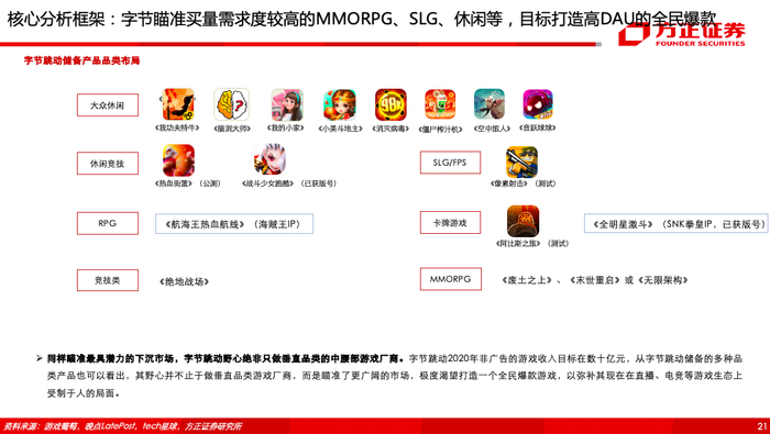 2、字节如何布局游戏?——新晋休闲游戏之王,通过收购+挖角+自建组建超千人游戏团队,进行重度游戏多品类布局,目标打造高DAU的全民爆款。