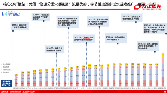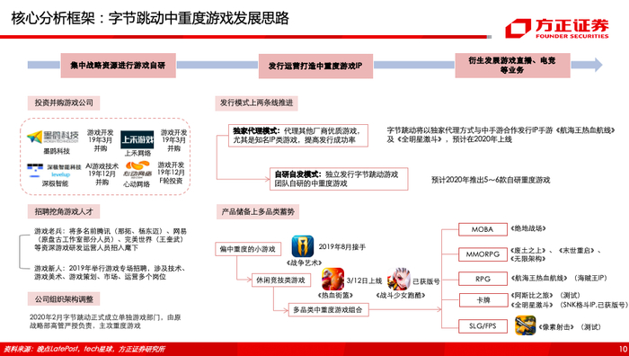 (1)字节跳动游戏战略:从渠道到发行到研发,不断向游戏产业上游进军,并通过自有渠道建立认知-轻度游戏积累画像-重度游戏收割用户。