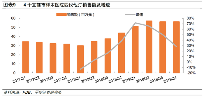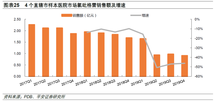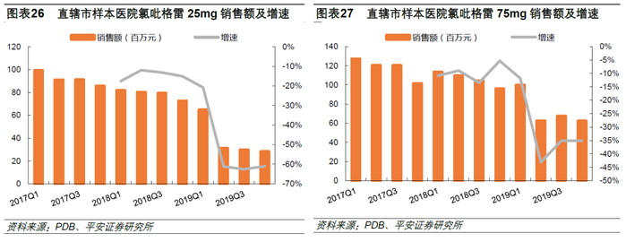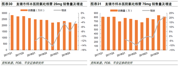 销售量增速整体呈上升趋势。2019Q4样本医院25mg和75mg的销售量增速分别为-3.66%和20.83%,整体呈上升趋势。其中75mg增速高于25mg。