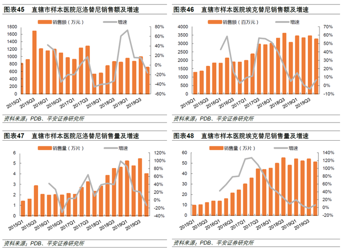 吉非替尼或享有一定程度的品间替代。吉非替尼、厄洛替尼、埃克替尼是第一代EGFR-TKI三大品种,临床效果相近。2019Q2-Q4厄洛替尼直辖市样本医院销售量增速分别为23.80%、20.56%和-13.11%;而同期埃克替尼销售量增速分别为4.68%、-2.06%和6.50%。可以看出吉非替尼纳入集采后,厄洛替尼、埃克替尼销售量增速都有不同程度的下降。我们认为这或许是因为吉非替尼纳入集采后,随着价格下降,较厄洛替尼、埃克替尼性价比优势进一步提升,产生一定程度的品间替代。