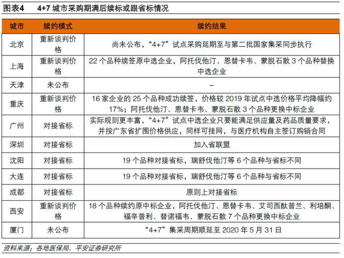“4+7”执行情况超预期,重新谈判or跟省标各地不同。2019年4月1日起,“4+7”带量采购在11个试点地区全面推开。截至2019年底,试点地区平均采购执行进度为183%,大幅超出约定采购量。从直辖市样本医院市场来看,2019Q2-Q4(集采后)与2018Q2-Q4(集采前)相比,25个带量采购品种销售额下滑44.74%,销售量增加9.73%,整体控费效果明显。目前“4+7”执行满一年,各地续标主要分为跟省标(非直辖市为主)和重新谈判(直辖市为主)两种方式,重新谈判模式中“4+7”扩面未中标的企业获得通过降价续标的机会。