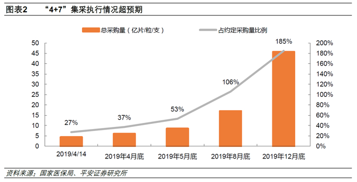 “4+7”集采执行情况超预期。本次带量采购以结果执行日起12个月为一个采购周期。2019年3月18日,厦门开出第一张国家“4+7”集采中选药品处方。4月1日起,“4+7”带量采购在11个试点地区全面推开。5月底,约定采购量完成比例达到53.18%;8月底,总采购量已经达到17亿片(支),超过约定总采购量;12月底,25个品种平均采购进度为185%,中选品种占通用名药品采购量的78%。从整体采购量角度看,“4+7”集采执行情况好于预期,原因一方面是集采首次报量,各地相对保守;另一方面,医疗机构为完成约定采购量,优先使用中标药品。