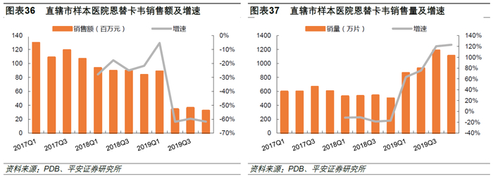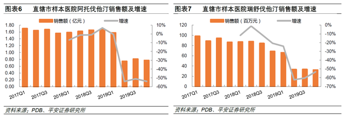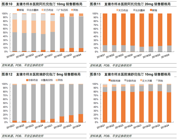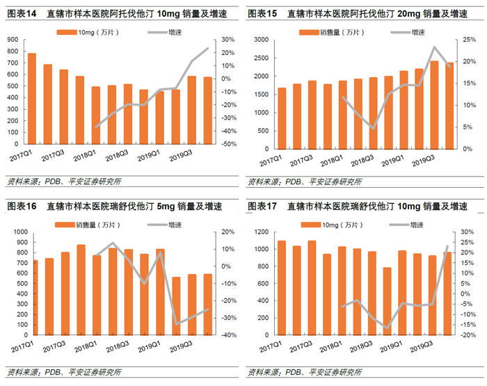 带量采购对品种销售额影响显著。2019Q2-Q4样本医院市场阿托伐他汀销售额分别同比下滑54.02%、51.05%和53.90%;而瑞舒伐他汀分别下滑62.44%、60.41%和53.32%。瑞舒伐他汀从2018Q3开始增速下滑,主要是其纳入上海市第三批带量采购,价格大幅下降。