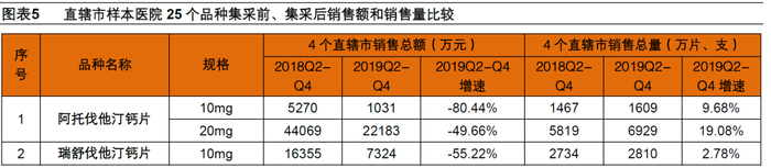 我们以北京、上海、天津、重庆四个地区(4个直辖市)为例,来说明“4+7”带量采购对中选品种销售额和销售量的影响。2019后3季度(Q2-Q4,集采后)与2018同期(Q2-Q4,集采前)相比,25个带量采购品种在4个直辖市样本医院合计销售额下滑44.74%,而销售量增加9.73%。“4+7”品种整体呈现“量增价减”的趋势,与此前预期基本一致,医保控费效果明显。