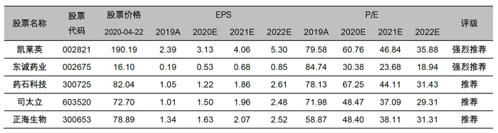 投资建议:2018年以来,行业政策方向已经明晰,我们预计2020年仍然处于行业政策密集推广的阶段。随着第二轮集采的开展,我们建议回避受政策压制领域,坚守政策免疫且符合行业发展趋势的高景气细分龙头,从分化中寻找散落的遗珠。1)主线一:创新产业链,随着技术实力的提升以及审批环境的改善,中国医药行业迎来自主创新的收获期,同时激活了CRO、CMO等相关外包产业链,重点推荐药石科技、凯莱英、安科生物、科伦药业等;2)主线二:高端医学影像产业链,受益于大型设备配置证松绑,尤其是相关显影剂耗材将持续充分受益,重点推荐核医学龙头东诚药业和碘造影剂龙头司太立;3)主线三:医疗消费升级赛道,包括口腔医疗、眼科、医美、体检等医疗服务及相关设备耗材领域,重点推荐通策医疗、爱尔眼科、美年健康、正海生物等。