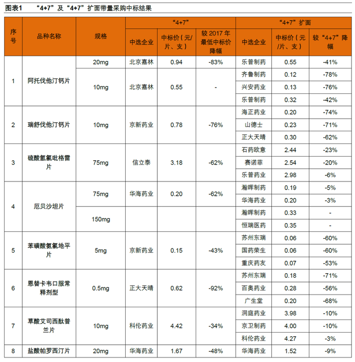 从续约结果来看,有省标的基本以对接省标模式为主,但需要注意的是有时并非完全按照省标来,部分品种存在替换省标的情况;而没有省标的直辖市基本以重新谈判价格模式为主。因此,对于“4+7”试点中标而扩面没中标的品种来说,实际情况可能好于预期。如京新药业的瑞舒伐他汀,通过降价在多个城市续标成功,成功保留了部分市场。