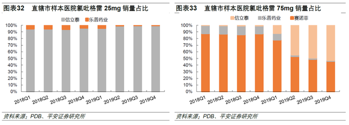 从销售额占比来看,25mg仅乐普药业和信立泰两家竞争,信立泰处于绝对领先地位;而75mg作为该品种的主流规格,原研赛诺菲的优势明显,2019Q4原研75mg销售额占比仍高达77.8%。