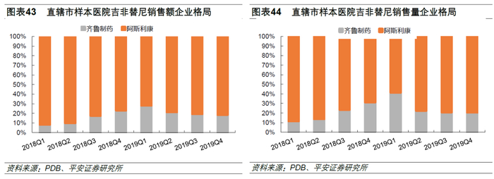 阿斯利康集采中标后,齐鲁制药的进口替代趋势暂时得到逆转。集采之前,齐鲁制药吉非替尼呈现明显的进口替代趋势,2019Q1销售量占比一度高达41.23%,销售额占比达到27.98%;集采后这一趋势得到逆转,2019Q4齐鲁制药销售量占比大幅下滑至20.49%,销售量下滑至18.49%。原研企业在重点品种纳入带量采购时,在中标价不低于成本价的前提下,其同样拥有较强的中标动力。一方面,重点品种能够贡献稳定的现金流;另一方面,保留重点品种有利于维持现有渠道网络。