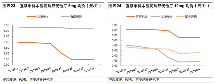 集采后销量增速整体呈上升趋势,瑞舒伐他汀5mg销售增速下滑。集采后阿托伐他汀销售量增速呈提升趋势。而瑞舒伐他汀5mg规格销量增速下滑,2019Q2-Q4直辖市样本医院销量增速分别为-33.81%、-29.62%和-25.02%,我们认为可能是因为该规格此前近90%的销量被鲁南贝特占据,集采对未中标的仿制药企业的冲击比原研药更大。