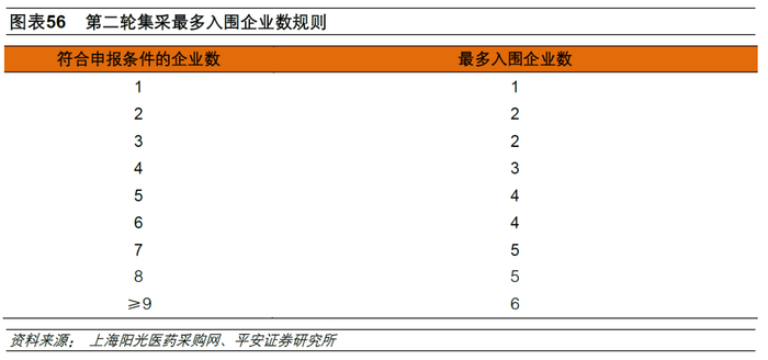 根据规则,本次集采实际中标企业达到4家及以上的,首年约定采购量可达约定采购量计算基数的80%,采购周期可达到3年。我们认为这种规则设计可有效避免中标企业供应不足的问题。但考虑到采购周期最多可达3年,一旦企业没有中标,则很大可能彻底退出市场。