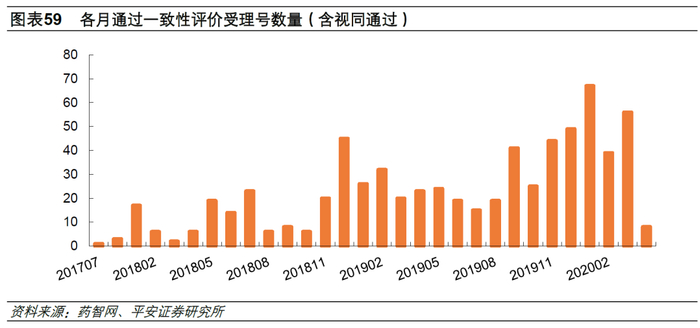 一致性评价是集采入场券,目前过评品种超200个。只有通过一致性评价,才能认为仿制药和原研药在质量和疗效上是一致的,这也是仿制药企业参与集采的必要条件。此前纳入集采的品种均为有仿制药过评的品种。而此前因为过评品种少,在一定程度上拖累了集采步伐,目前纳入集采的品种一共仅57个。而根据药智网数据,截至2020年4月20日,通过一致性评价的品种数达到212个,仍有155个品种未纳入集采。我们认为当前一致性评价掣肘因素基本消除,未来集采落地节奏有望提速。