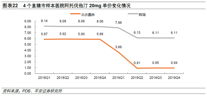 带量采购中选品种放量带动原研品种价格下降,但价格悬殊仍然巨大。2019Q3辉瑞20mg规格在4个直辖市样本医院均价为6.11元/片,北京嘉林仅0.95元/片(与中标价基本一致),辉瑞高出543%。