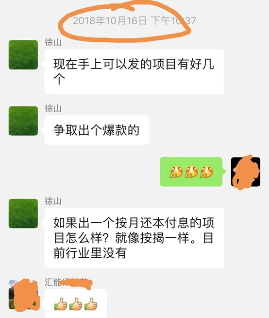 就10月16日,徐山还在微信群聊称,“现在手上可以发的项目有好几个,争取出个爆款,如果出一个按月还本付息的项目怎么样?就像按揭一样,目前行业里还没有先例。”