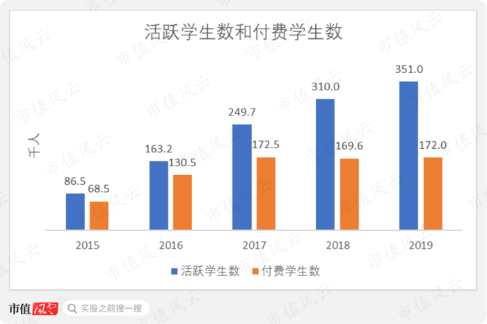2019年,活跃学生数是35.1万,付费学生数是17.2万。
