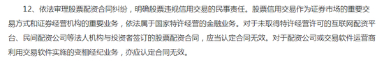2019年6月,最高人民法院发布了《关于为设立科创板并试点注册制改革提供司法保障的若干意见》。“意见”第12条为配合监管部门防止资金违规入市助涨助跌,明确提出:对于未取得特许经营许可的互联网配资平台、民间配资公司等法人机构与投资者签订的股票配资合同,人民法院应认定合同无效。