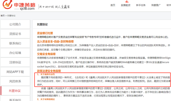 记者调查发现,不少配资平台均在官网粉饰配资的合法性。例如,申捷策略在介绍托管协议时声称:“政策法律安全有保障”,表示“融资属于民间借贷的一种形式”。