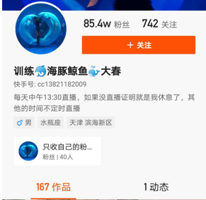 周延同是天津海昌极地海洋公园的驯养师,他在运营一个叫“大白与周老师”的快手账号。“大白与周老师”(快手号:JoyZhoul )目前已经有41.5万粉丝,但这还不是天津海昌极地海洋公园明星驯养师最大的快手号。2017年至今,馆内52名驯养师,大部分都开设了短视频账号,有5位驯养师的粉丝数量超过了5万,其中驯养员赵迎春的账号“训练海豚鲸鱼大春”(快手号:CC13821182009) 的粉丝超过90万。