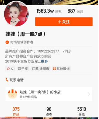 案例简介:夫妇二人在开展快手直播前已打拼多年,最初以摆地摊来维持生计,主要卖箱包、饰品和衣服等,2008年日营收达到200元。进驻商场后开始网上进货,日营业额达4000元,2009年达到1万元。随后夫妇开始经营网店,2011年由箱包转为服装,因一件爆款产品,不到两个月赚到200万元。随后业务快速增长,2010年底到2014年底赚了一亿元。在此之后生意进入低迷期,开始接触快手。起初夫妇仅作为个人用户玩快手,收获一定关注后开始展示产品及穿搭,2017年已积攒500万的粉丝。2017年“双11”期间,通过快手导入流量,半小时就实现了500多万元的销售额。目前快手粉丝已经达到1100多万。一场直播可以卖出七八十万元的商品,较好时可以卖出一两百万元。如果直播人数达到10万,转化率最少可以达到10%。同时因为快手的导流,网店的复购率也达到了75%-80%。