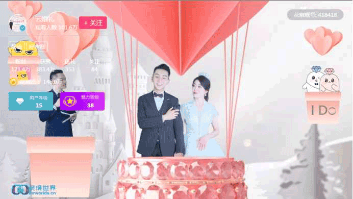 另一方面依托先进的MR虚拟影像合成技术,比如伴随仪式始终的气球和气泡背景、花窗和城堡的场景转化,通过实现多样化的特效,营造出与线下婚礼毫不逊色的浪漫气氛。