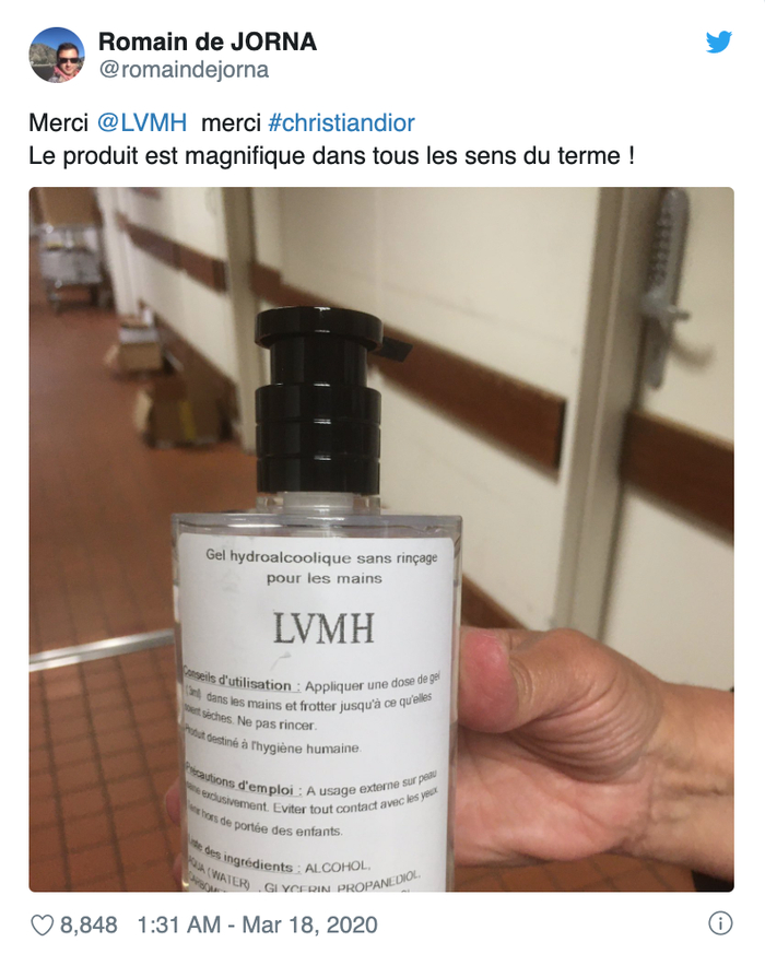 法国时间 3 月 15 日,法国 LVMH 集团表示,旗下 Dior、Guerlain、Givenchy 的香水与化妆品生产线,将临时转产酒精凝胶,产出的制品将捐赠给医疗卫生机构。项目从政府呼吁、监管机构检测,再到投产,只用了不到 72 小时。自带洗手液产品生产线的 Dior 率先启动,生产的洗手液直接采用 Dior 护肤品瓶包装,瓶身贴有简单的使用说明标签,一推出就在各大社交网络引起热议。