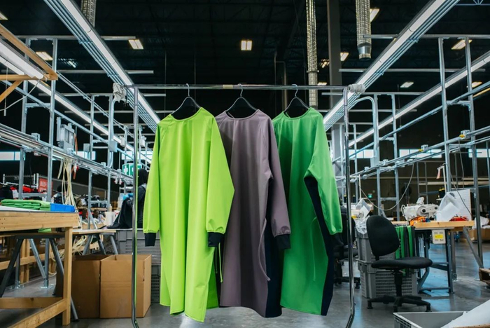 加拿大户外品牌始祖鸟(ARC'TERYX)与当地卫生部门、邻近制造品牌合作,在十余天里共同设计出符合医用需求、可重复使用的防护服。防护服使用现有户外防水面料、更改缝制方法制成。规格数据与服装裁片均在网上公开,以便更多机构制作。
