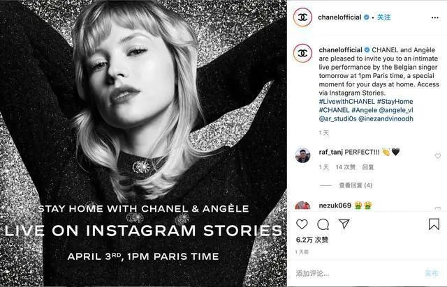 Chanel 邀请比利时女歌手安吉尔(Angèle),在官方 Instagram 上举办线上演唱会。这不是安吉尔第一次与 Chanel 合作了,她曾在 2019 年年底 Chanel 巴黎高级工坊(Métiers d’Art)大秀上表演,还参与拍摄了 Chanel 2020 眼镜系列的广告。Chanel 还在 Apple Music 上创建了名为“The Sound of Chanel”的歌单。
