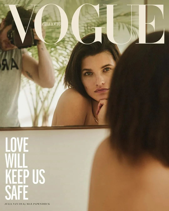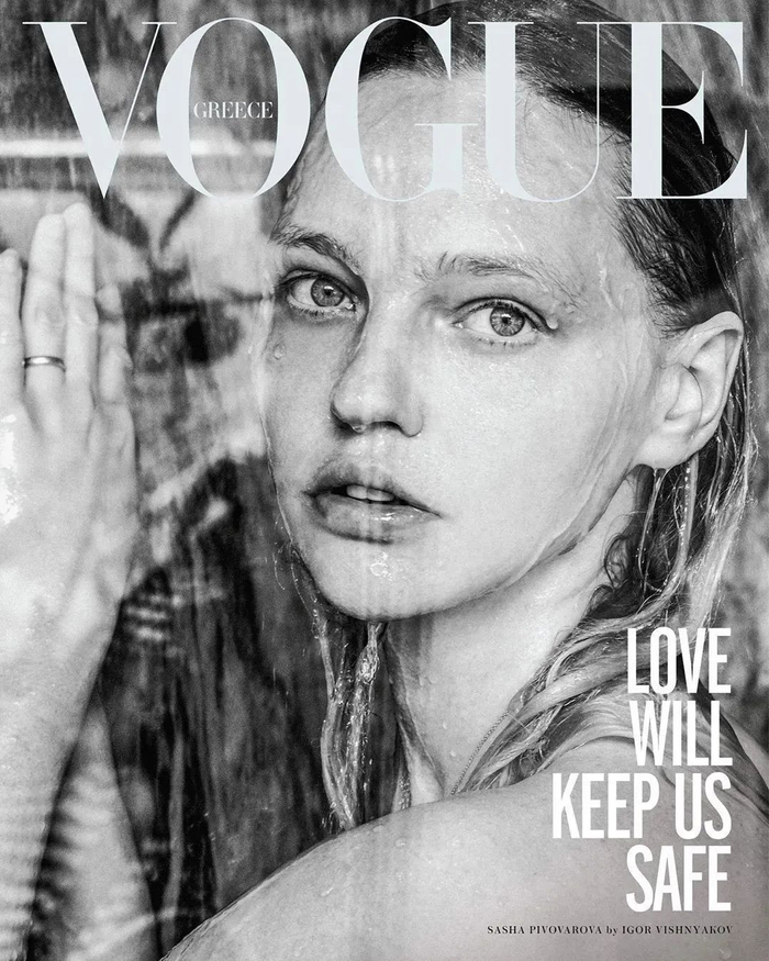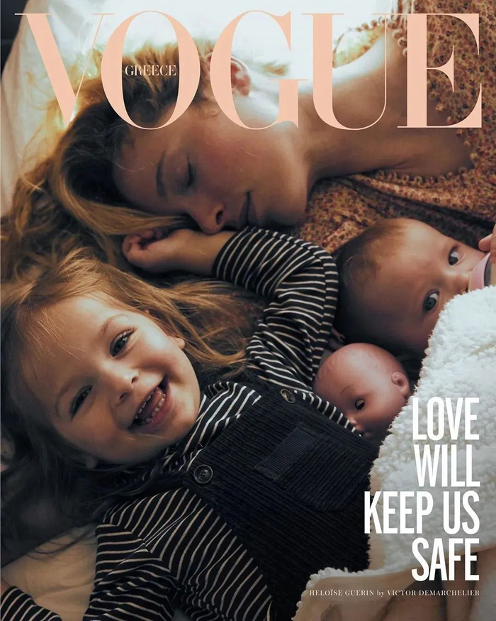 希腊版《VOGUE》杂志 5 月号以“爱让我们安全”(Love will keep us safe)为主题,配合主题,杂志邀请3位模特,让她们的伴侣在家为其拍摄照片,然后杂志以这些照片作为封面。